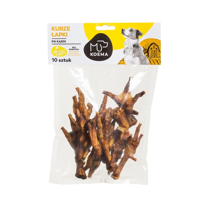 Koema kurze łapki to w pełni naturalny gryzak, przeznaczony dla psów w każdym wieku oraz każdej rasy. Naturalny oraz zdrowy gryzak w postaci kurzych łapek występuje w małym rozmiarze oraz polecany jest szczególnie ze względu na wsparcie w czyszczeniu zębów, ponieważ psy gryząc, ścierają kamień nazębny, dbając przy tym o higienę jamy ustnej.